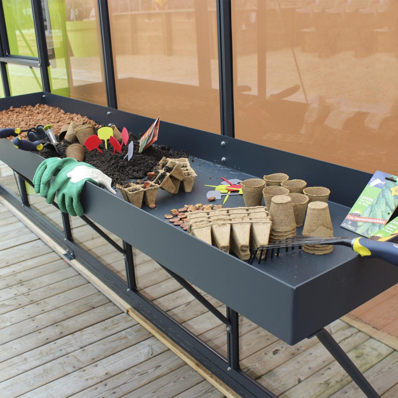 Este bancal se fija a los perfiles del invernadero (con las ménsulas y la tornillería suministradas) a la altura elegida. El bancal incluye 2 manillas que pueden instalarse si se desea.