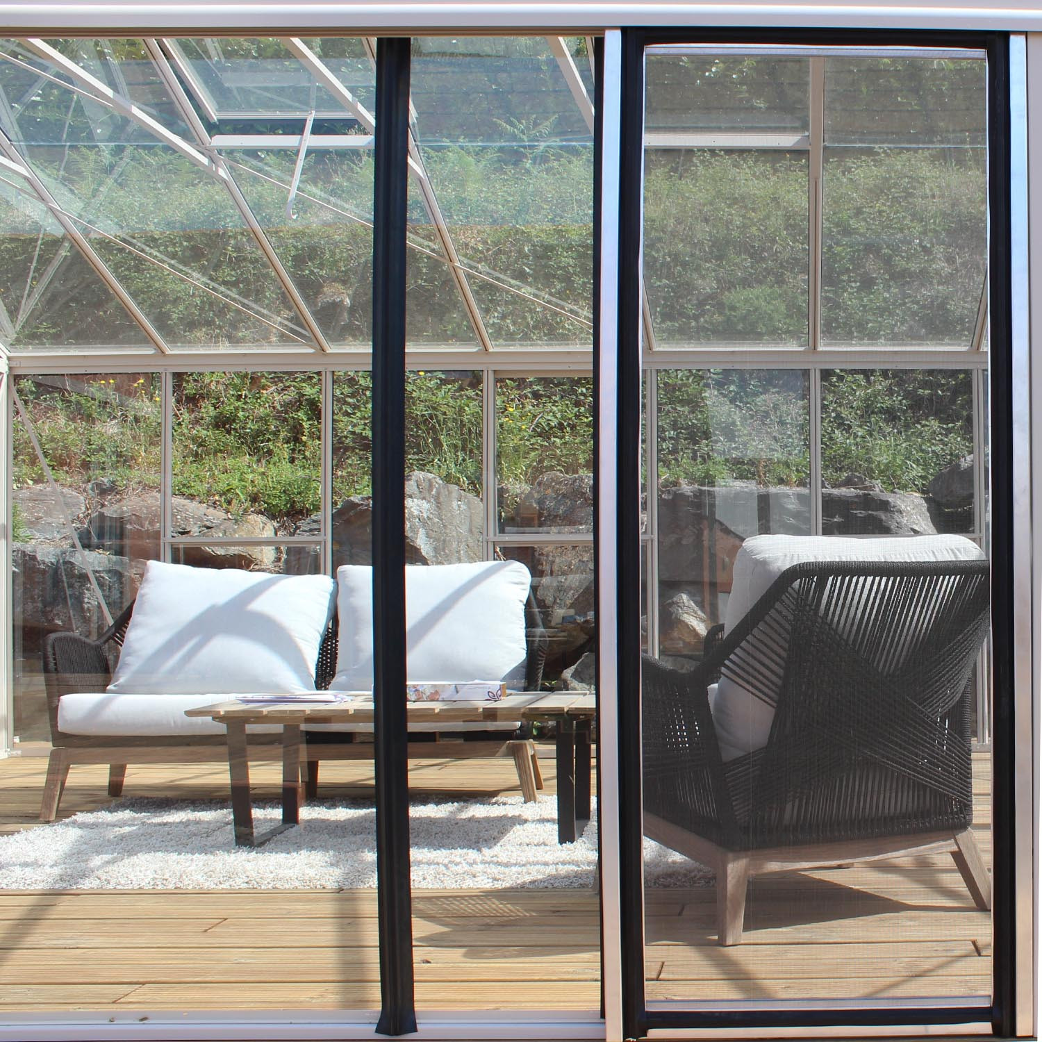 Puerta mosquitera de anchura 0,70 m. La puerta se desliza sobre los rieles existentes de las puertas del invernadero.