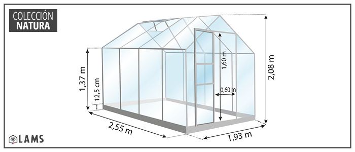 Invernadero de jardín LAMS Allium 1,93 m x 2,55 m - Altura cumbrera 2,08 m - Altura canalón 1,37m – Cristal templado transparente - Conector y descenso de canalón - Base incluida