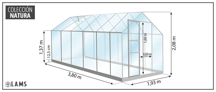 Invernadero de jardín LAMS Allium 1,93 m x 3,80 m - Altura cumbrera 2,08 m - Altura canalón 1,37m – Cristal templado transparente - Conector y descenso de canalón incluido - Base incluida