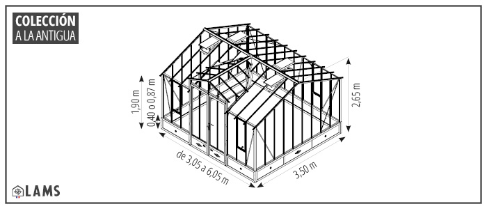 El invernadero CLASSIQUE 3,50 m con buhardilla en muro bajo está disponible en 5 longitudes (de 3,05 hasta 6,05 m). Está equipado de una puerta doble (2 x An. 0,77 x Al. 1,95 m) en el lado largo y lucernas en los laterales y en el techo.