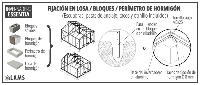 - Perímetro de hormigón o bloques sólidos: Fije la base de su invernadero al perímetro de hormigón o los bloques sólidos utilizando los soportes de fijación suministrados (se incluyen tacos de hormigón de 8 mm de diámetro y los tornillos).