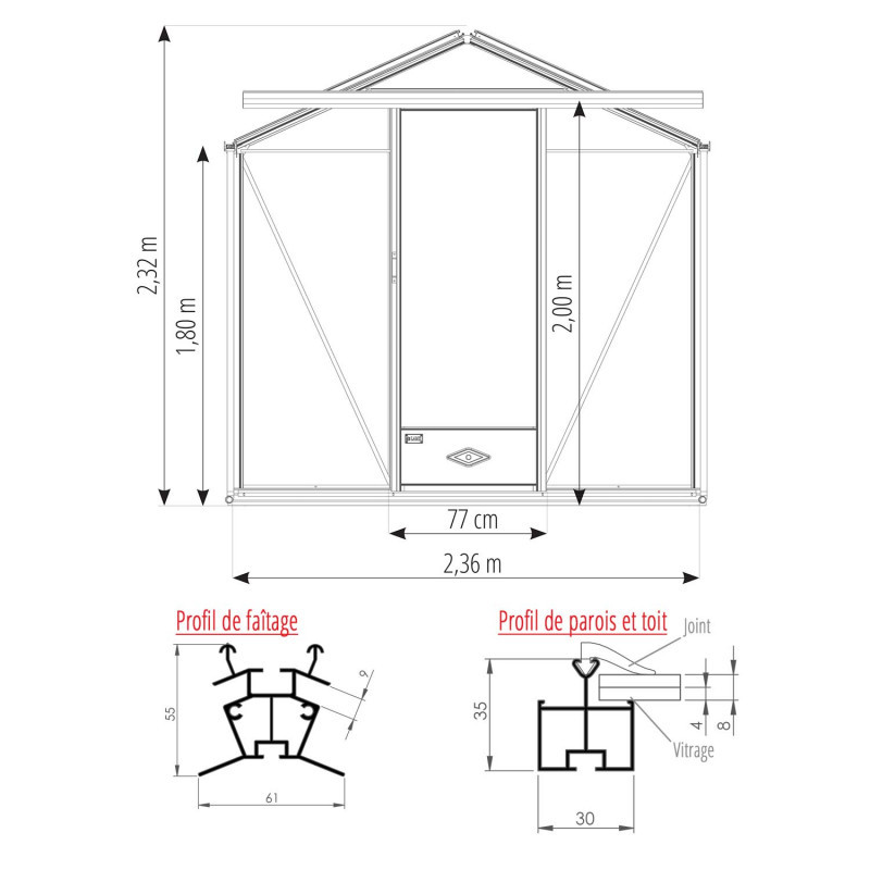 | Base | Incluida, altura 10 cm - En aluminio y lacado al color del invernadero |