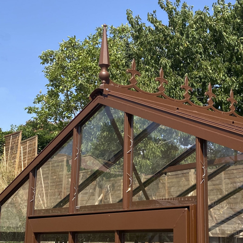El friso se instala sobre la cumbrera de su invernadero para darle un estilo victoriano. Está compuesta de molduras en forma de flores de lis. de moulures en forme de fleurs de lys. Todo el friso está fabricado en fundición de aluminio y lacado en el color de su invernadero.