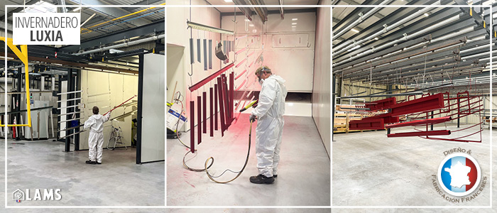 Consiste en aplicar una pintura en polvo carga electrostática que se adhiere perfectamente a la superficie del invernadero. Después del recubrimiento, las piezas se introducen en un horno donde se calientan durante 20 minutos a 200°C.