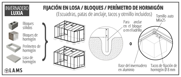 | Fijación del invernadero al suelo | Perímetro, bloques o losa de hormigón (pies de anclaje incluidos) - Plan de albañilería suministrado |