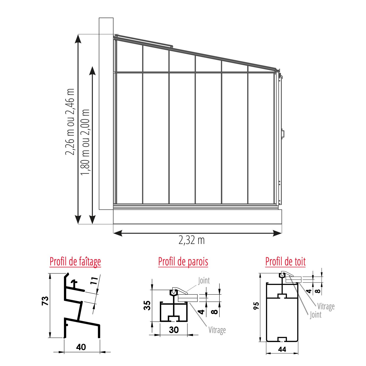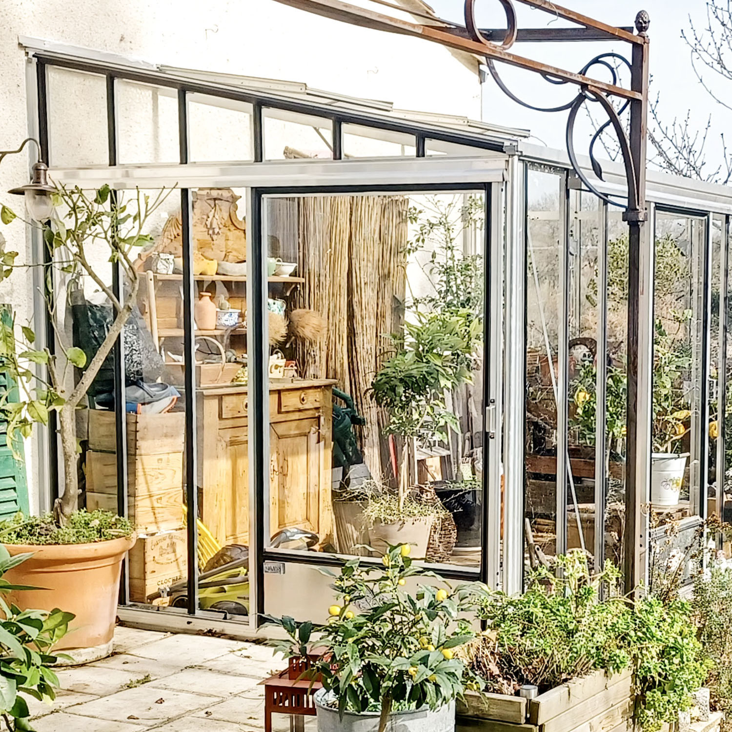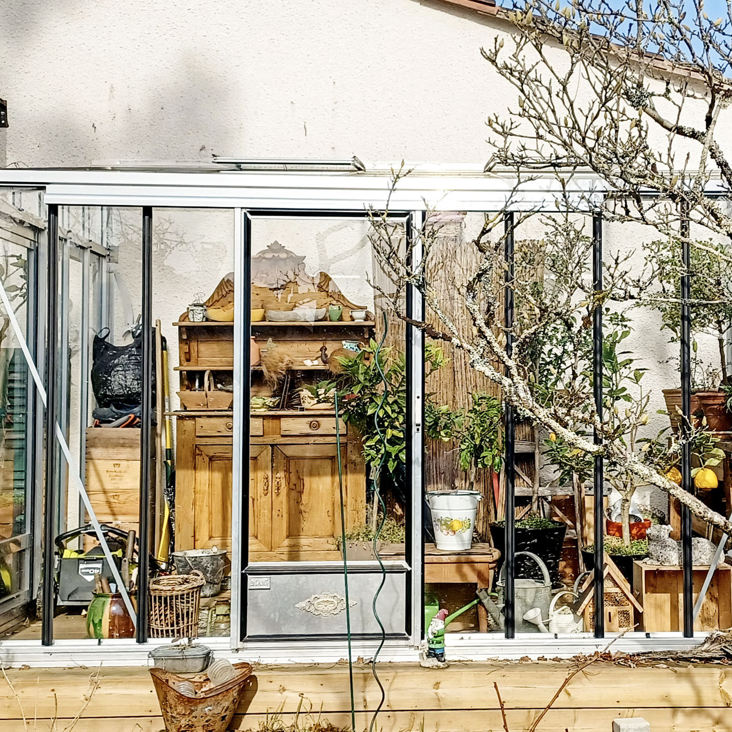 Con una anchura de 2,32 m, el invernadero en vidrio templado y aluminio LUXIA Retro adosado está disponible en 6 longitudes: 2,36 m - 3,09 m - 3,80 m - 4,57 m - 5,30 m - 6,04 m.