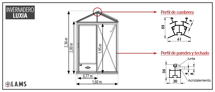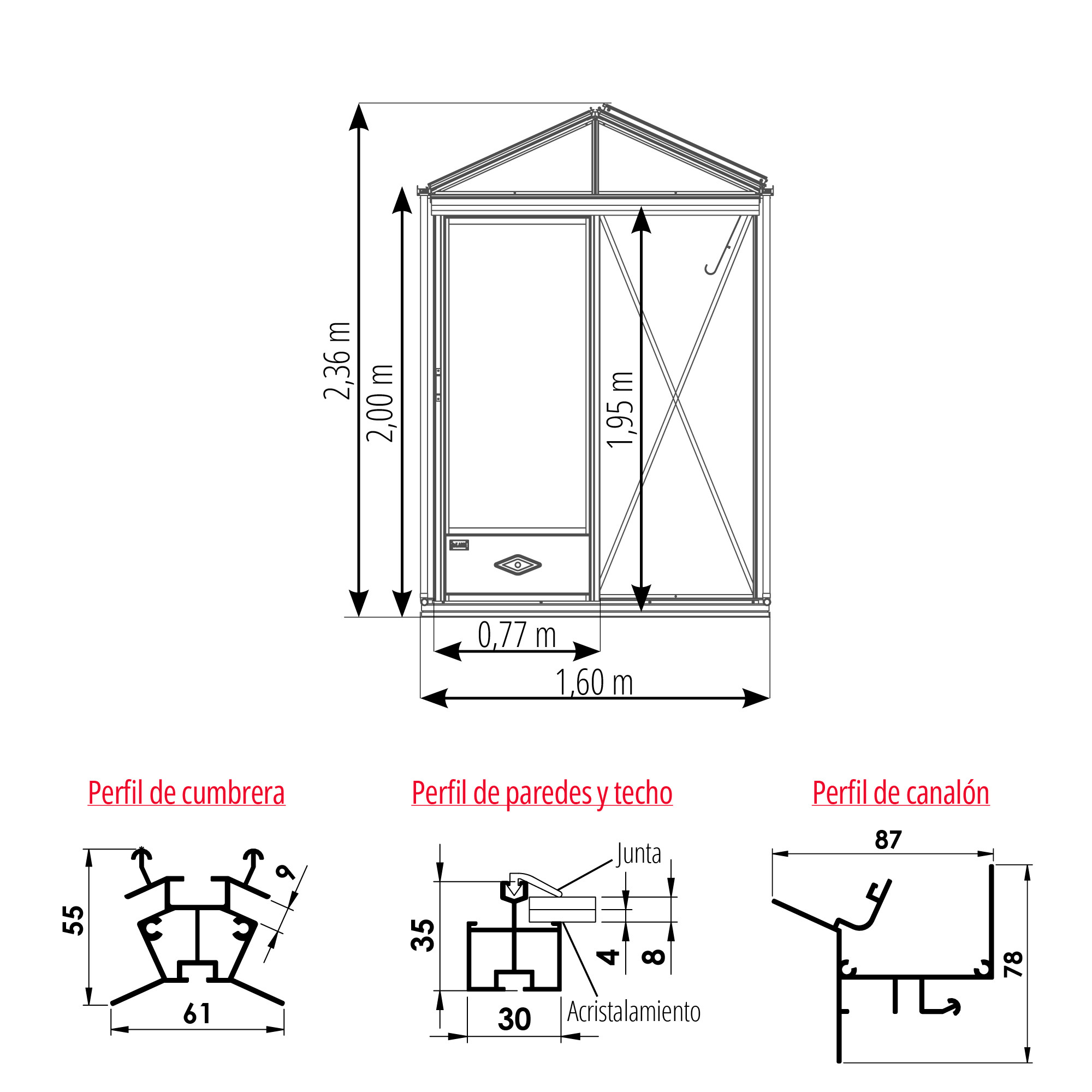| Base | Incluida, altura 10 cm - En aluminio y lacado al color del invernadero |
