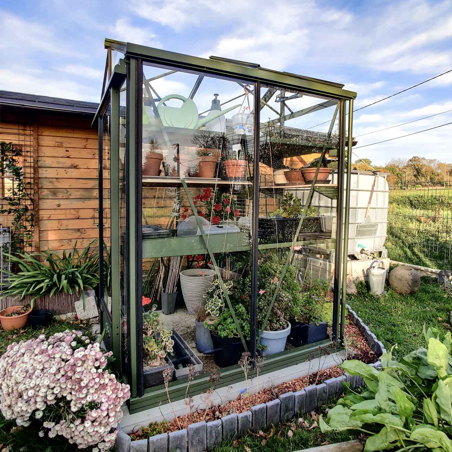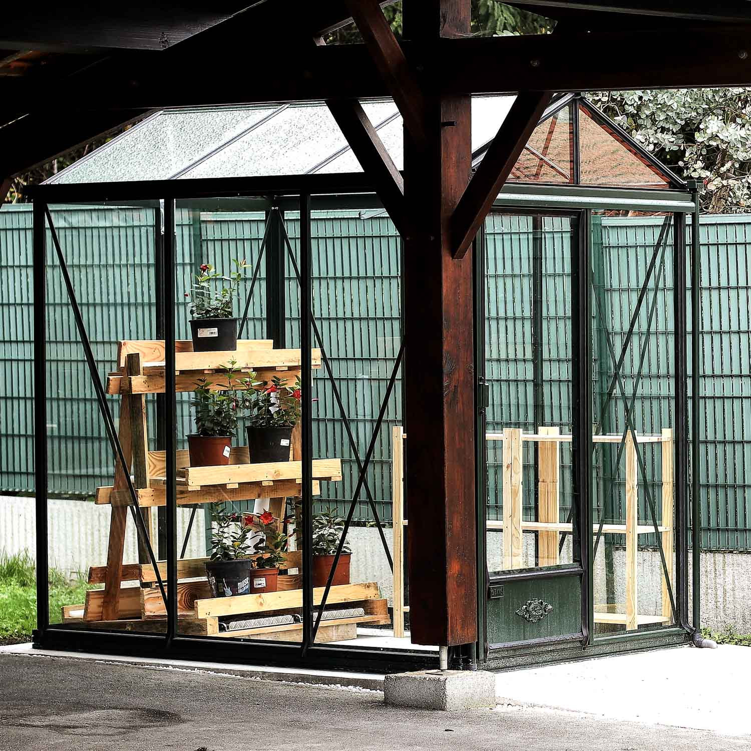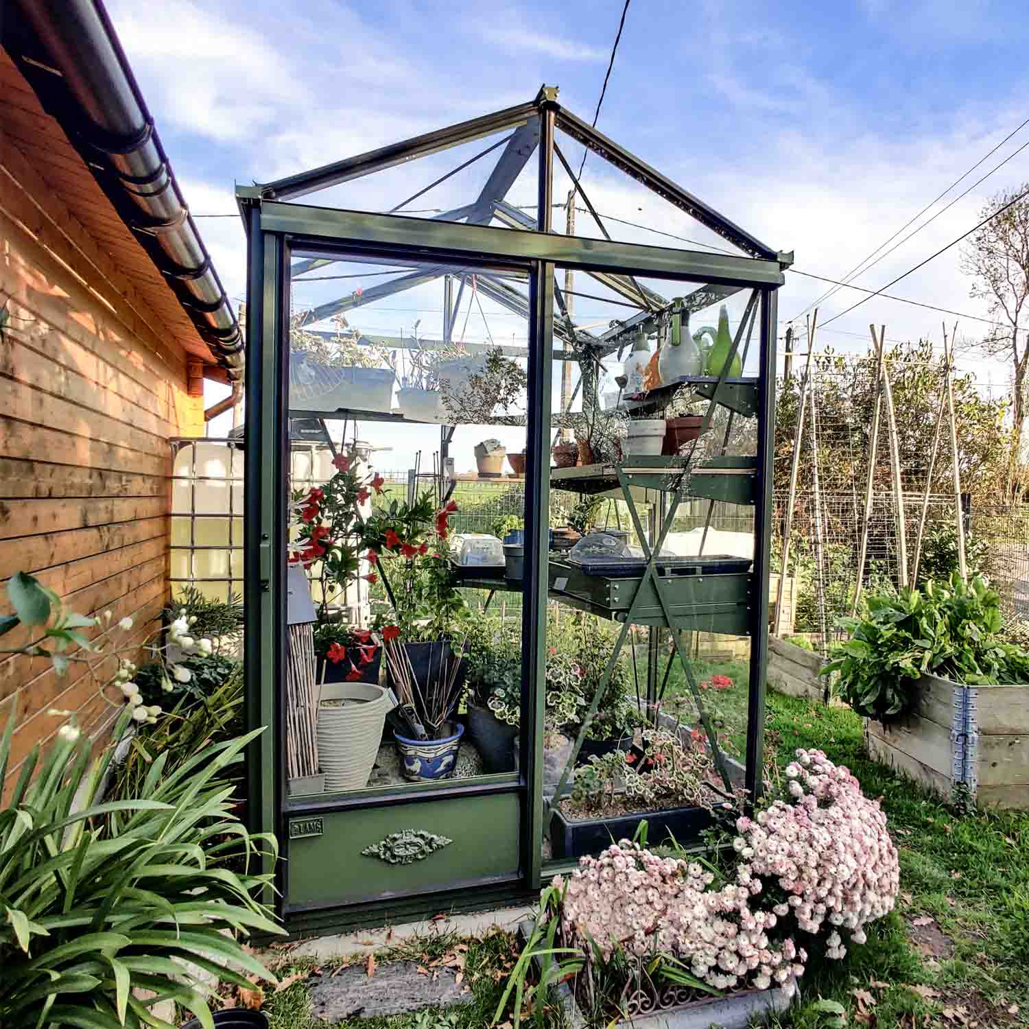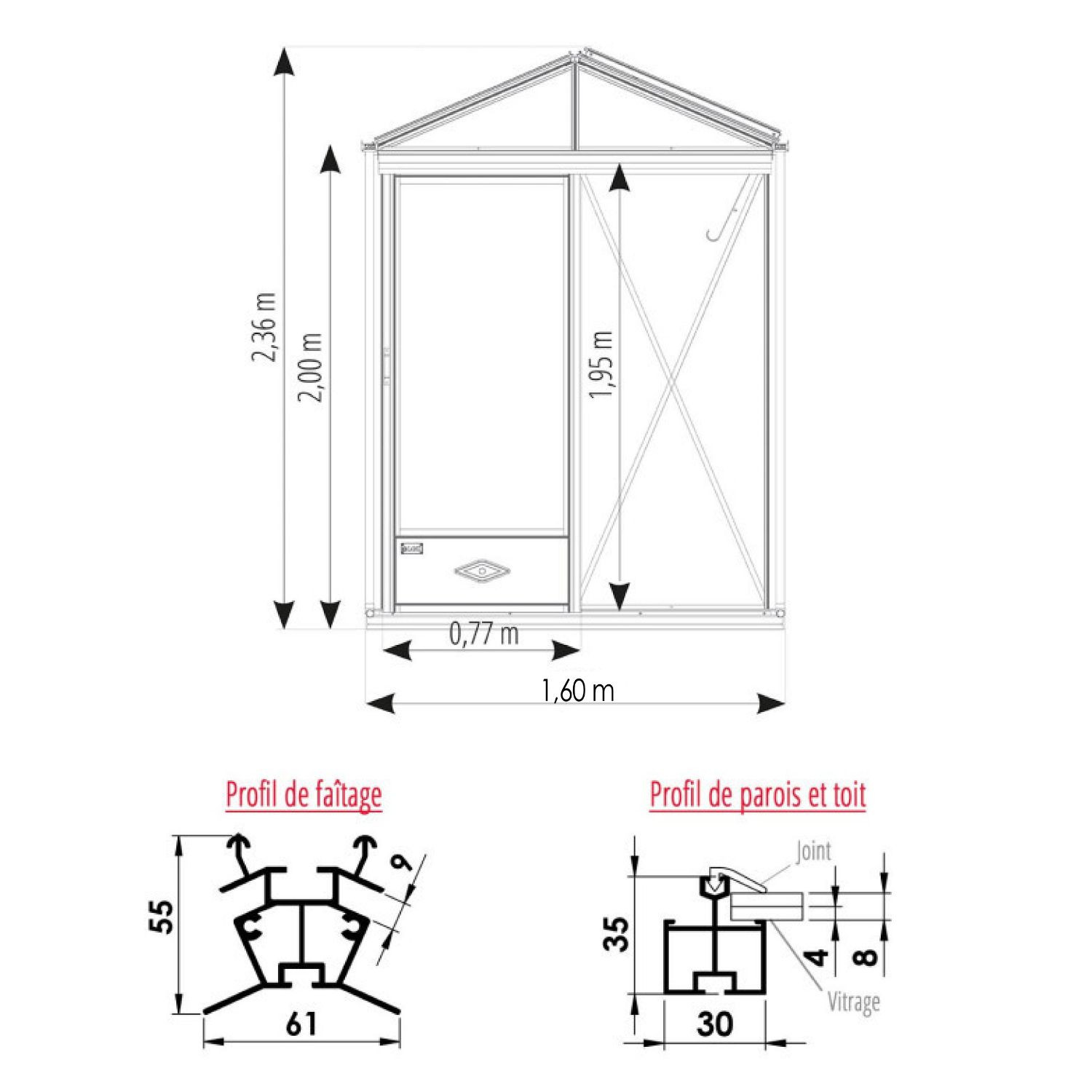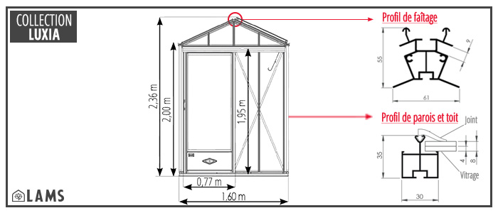 Con una fachada de 1,60 m, el invernadero de cristal templado y aluminio LUXIA está disponible en 3 longitudes: 1,60 m - 2,36 m y 3,09 m.