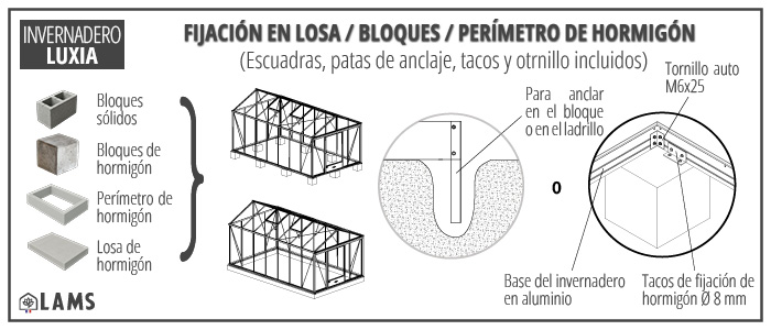 | Fijación del invernadero al suelo | Perímetro, bloques o losa de hormigón (pies de anclaje incluidos) - Plan de albañilería suministrado |
