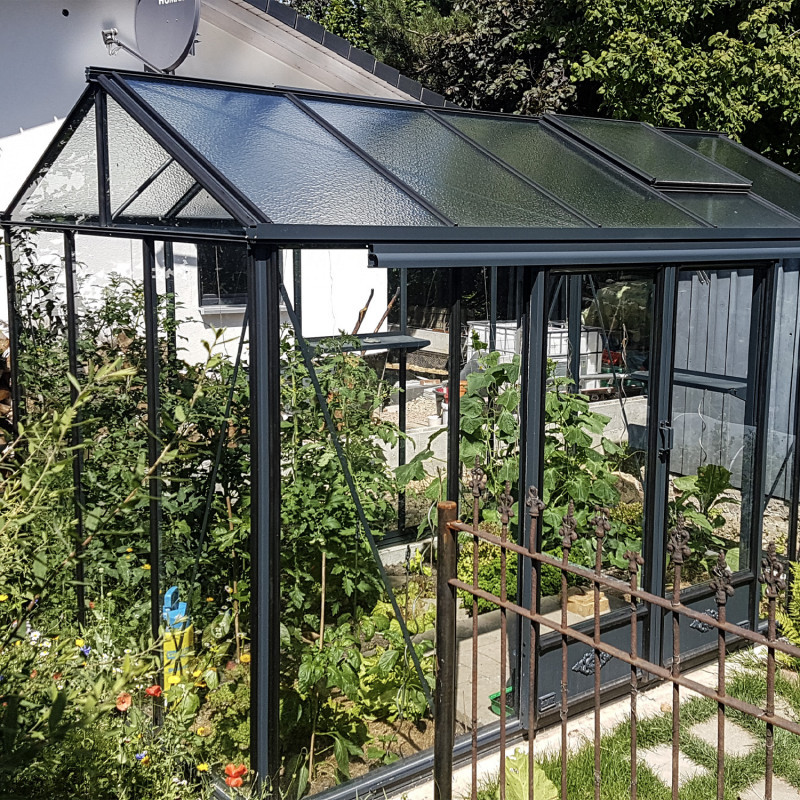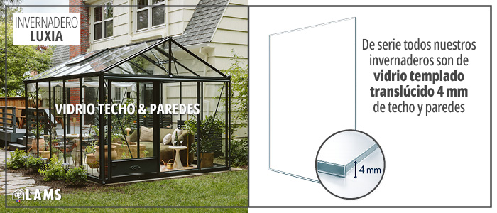Los perfiles del invernadero LUXIA permiten la instalación de un acristalamiento de 4 a 8 mm de espesor. Por lo tanto, también puede sustituir el cristal templado en los lados o en el techo por policarbonato de 8 mm de espesor con tratamiento UV fabricado en Europa .