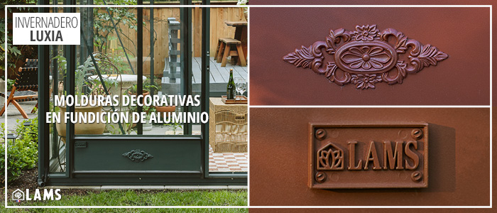 Las molduras decorativas en la puerta son de fundición de aluminio y lacadas al color del invernadero.