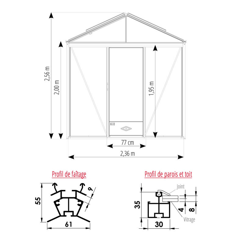 Con una fachada de 2,36 m, el invernadero de cristal templado y aluminio LUXIA está disponible en 6 longitudes desde 2,36 m hasta 6,04 m.