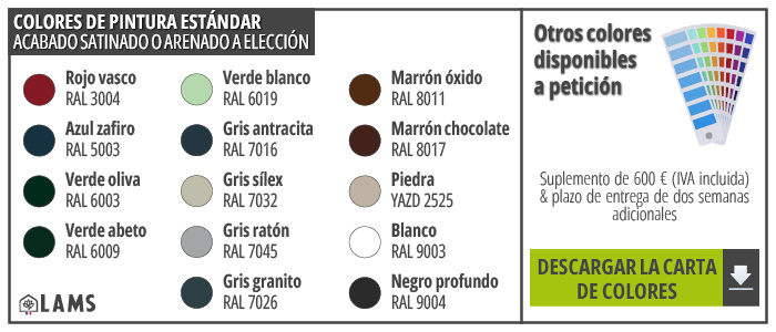 Con un coste adicional de 600 € (IVA incluido) y un plazo de entrega ampliado de dos semanas, podemos realizar el color RAL que elijas.