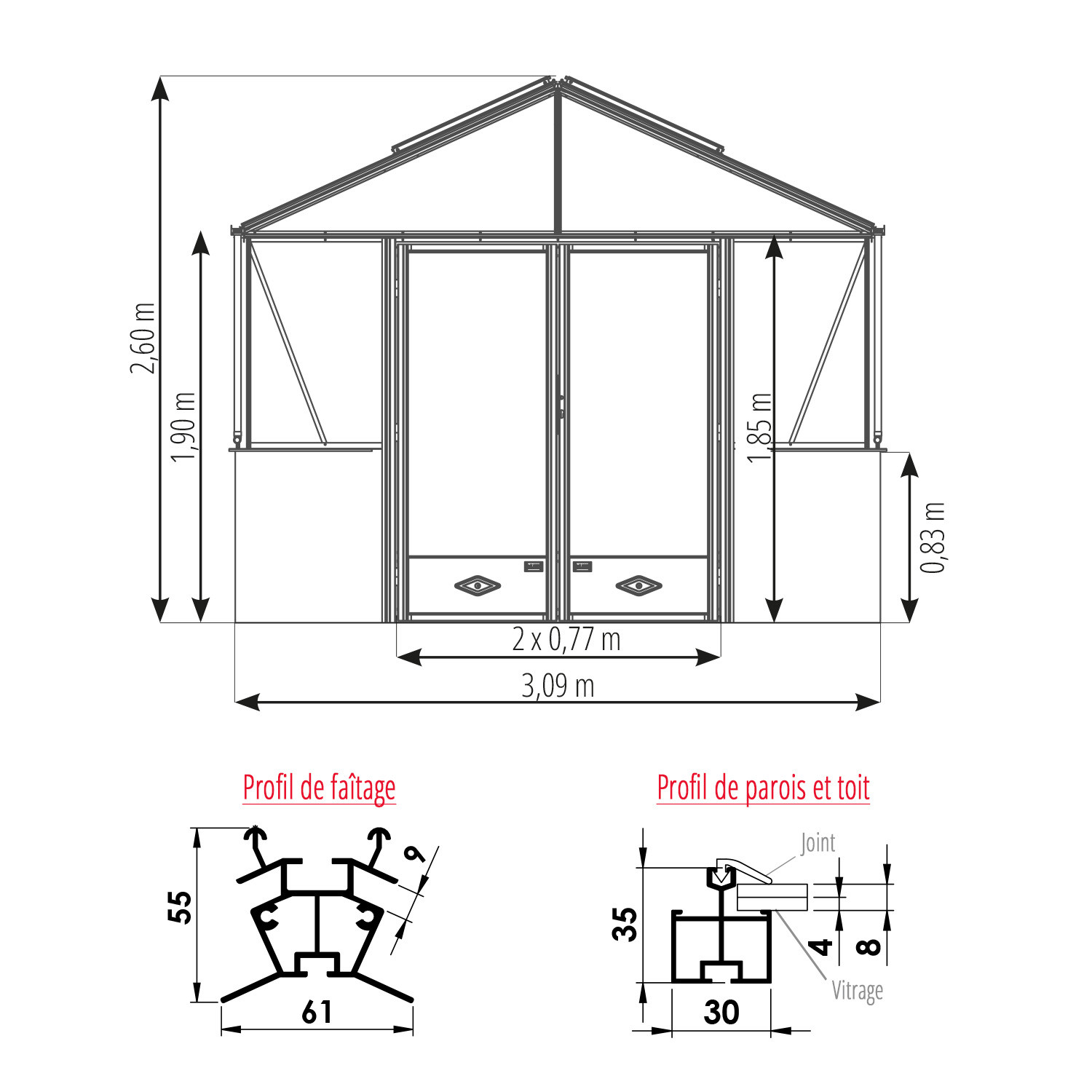 Con una anchura de 3,09 m, el invernadero en vidrio templado y aluminio LUXIA en muro está disponible en 5 longitudes: 3,09 m - 3,80 m - 4,57 m - 5,30 m -6,04 m.