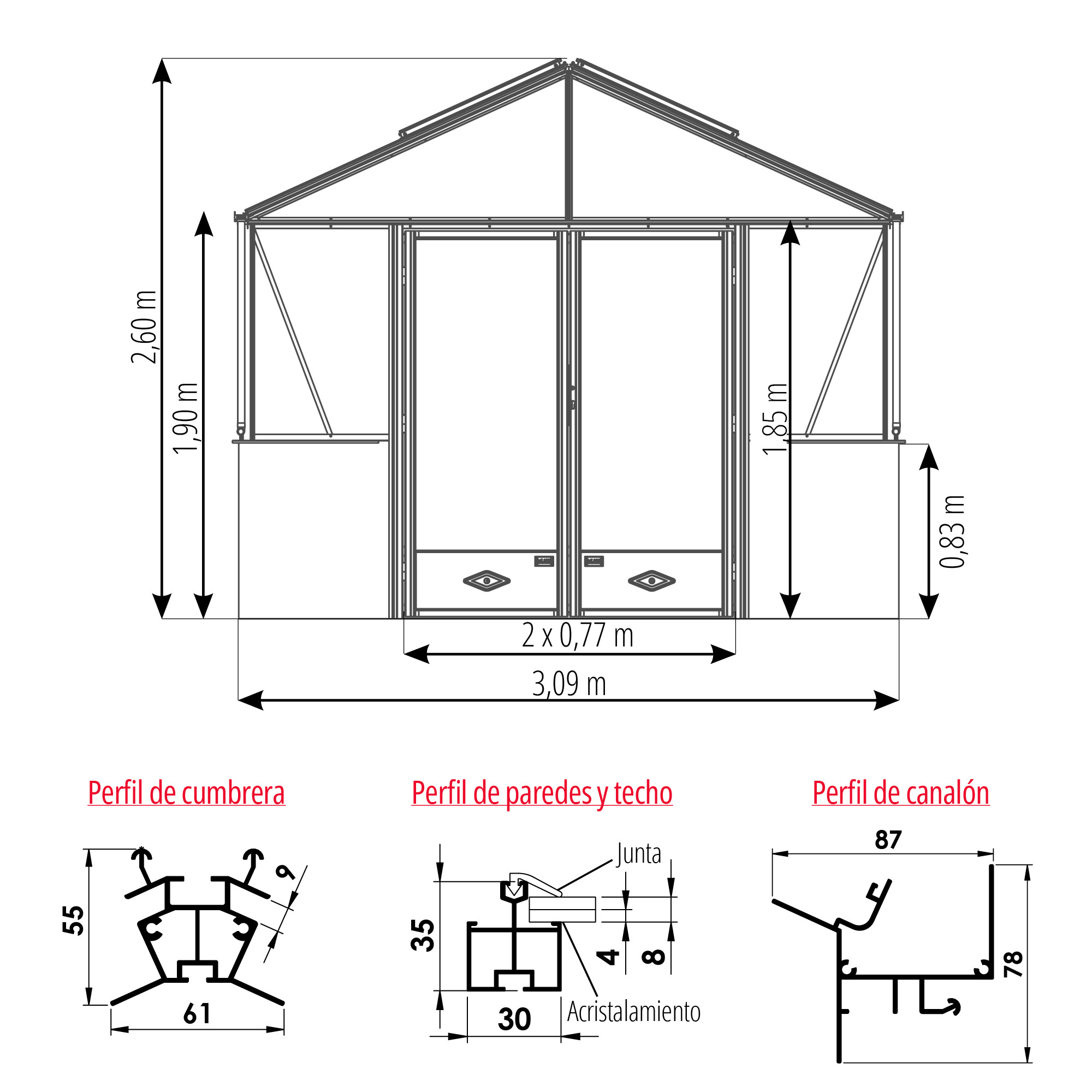 | Tipo de invernadero | A dos aguas (autoportante) |