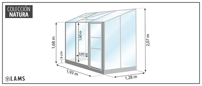 La estructura del invernadero adosado LAMS es en aluminio lacado gris antracita, garantía 10 años. El aluminio es un material duradero que no requiere mantenimiento. Las paredes están de cristales templados de 3 mm para mayor de seguridad.