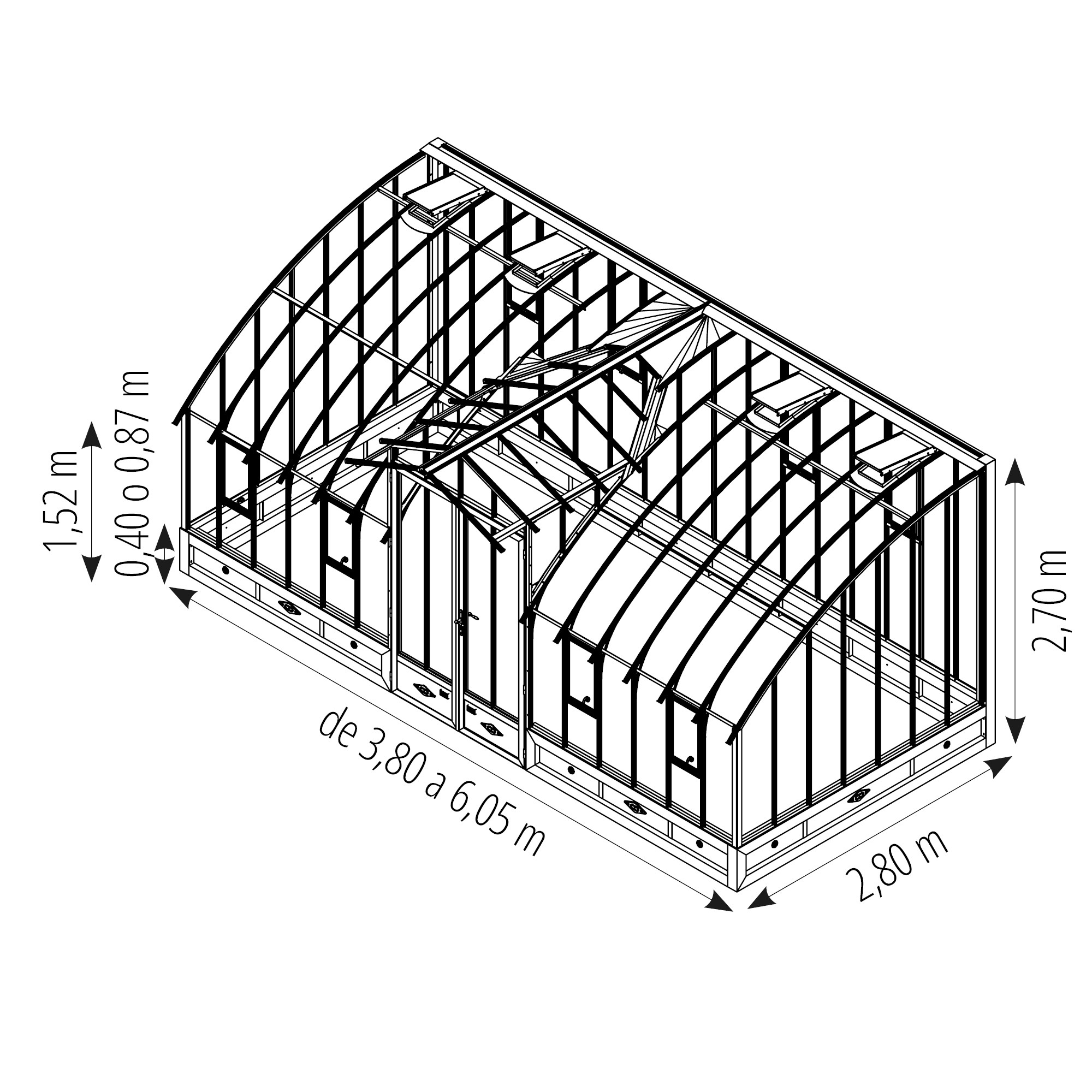 El invernadero MIRABEAU 2,80 m sobre base en aluminio está disponible en 4 longitudes (desde 3,80 m hasta 6,05 m). Está equipado de una buhardilla con una puerta doble (2 x An. 0,77 x Al. 1,95 m) en la fachada y lucernas en fachada, en la parte trasera y en el techo.