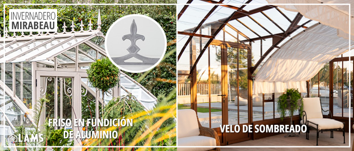 Equipe su invernadero antiguo LAMS MIRABEAU según sus deseos y la configuración de su jardín gracias a las opciones que le ofrecemos (puertas y lucernas adicionales, colores, sombreado...). Consulte nuestra sección accesorios para el diseño interior de su jardín de invierno LAMS MIRABEAU.