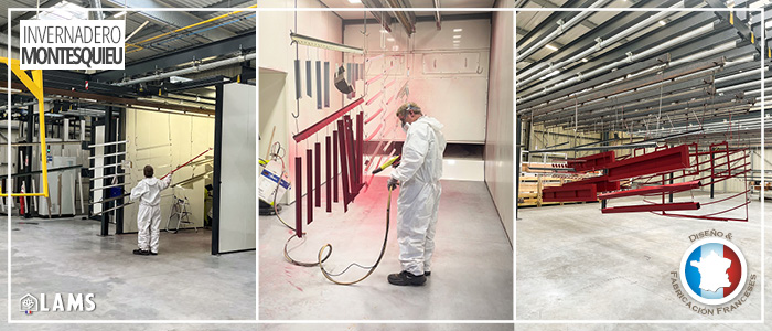 Consiste en aplicar una pintura en polvo caraga electrostática que se adhiere perfectamente a la superficie del invernadero. Después del recubrimiento, las piezas se introducen en un horno donde se calientan durante 20 minutos a 200°C.