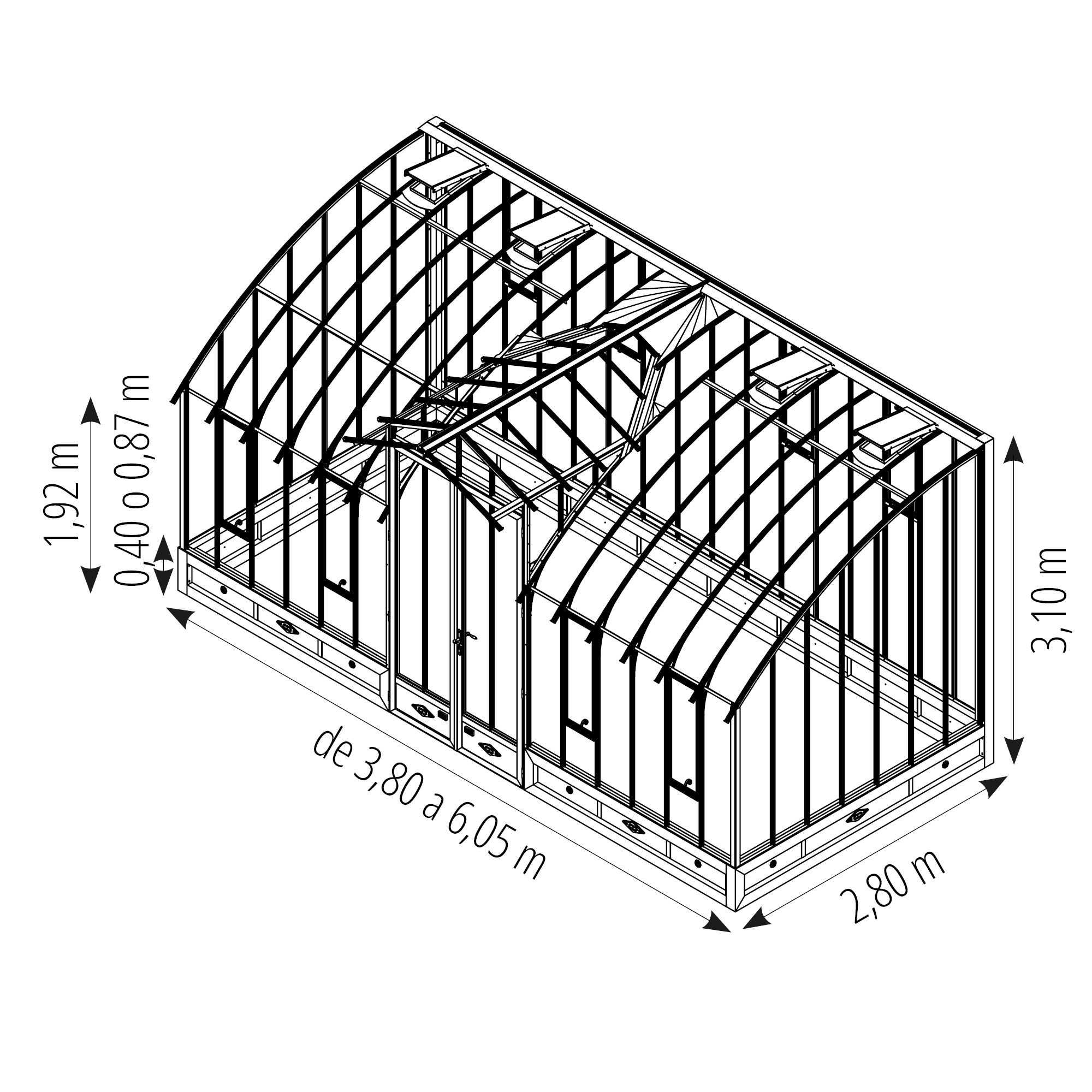 El invernadero MONTESQUIEU 2,80 m sobre muro está disponible en 4 longitudes (desde 3,80 m a 6,05 m). Está equipado de una buhardilla con una puerta doble (2 x An. 0,77 x Al. 1,95 m) en la fachada y lucernas en fachada et en el techo.
