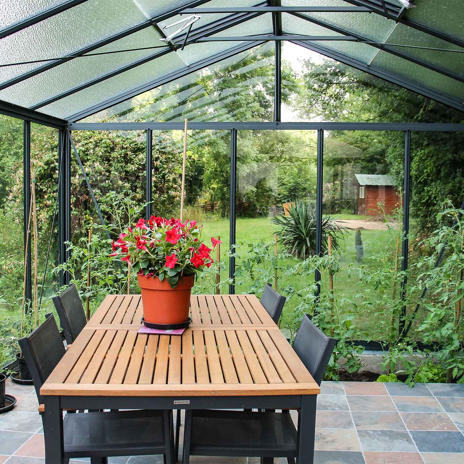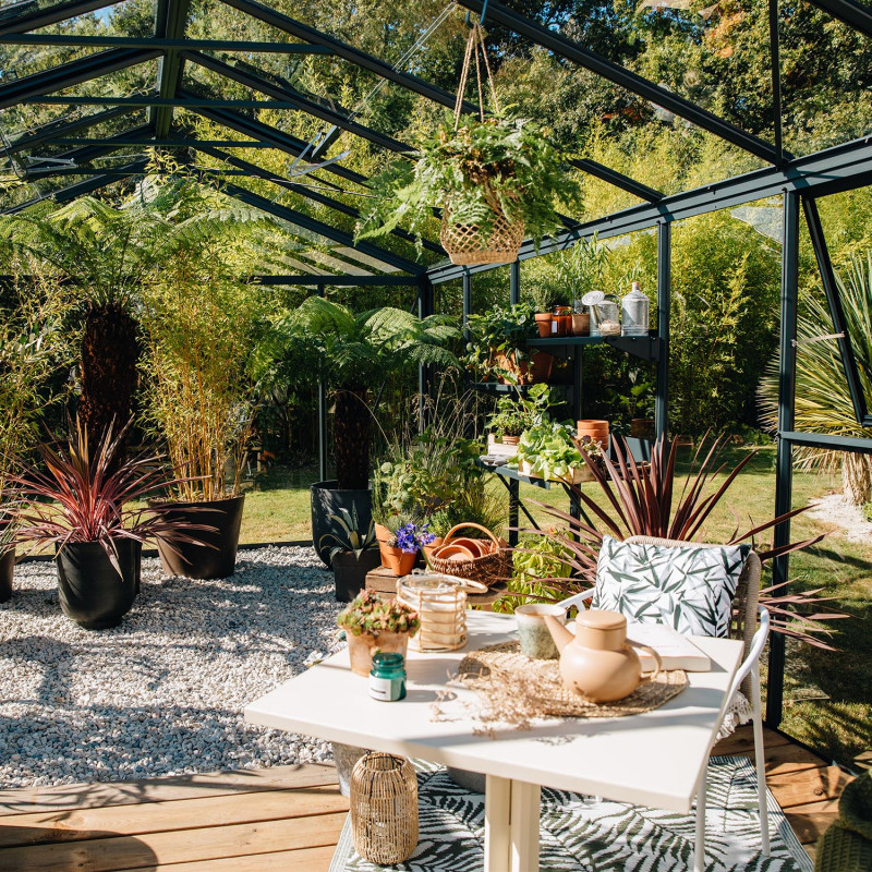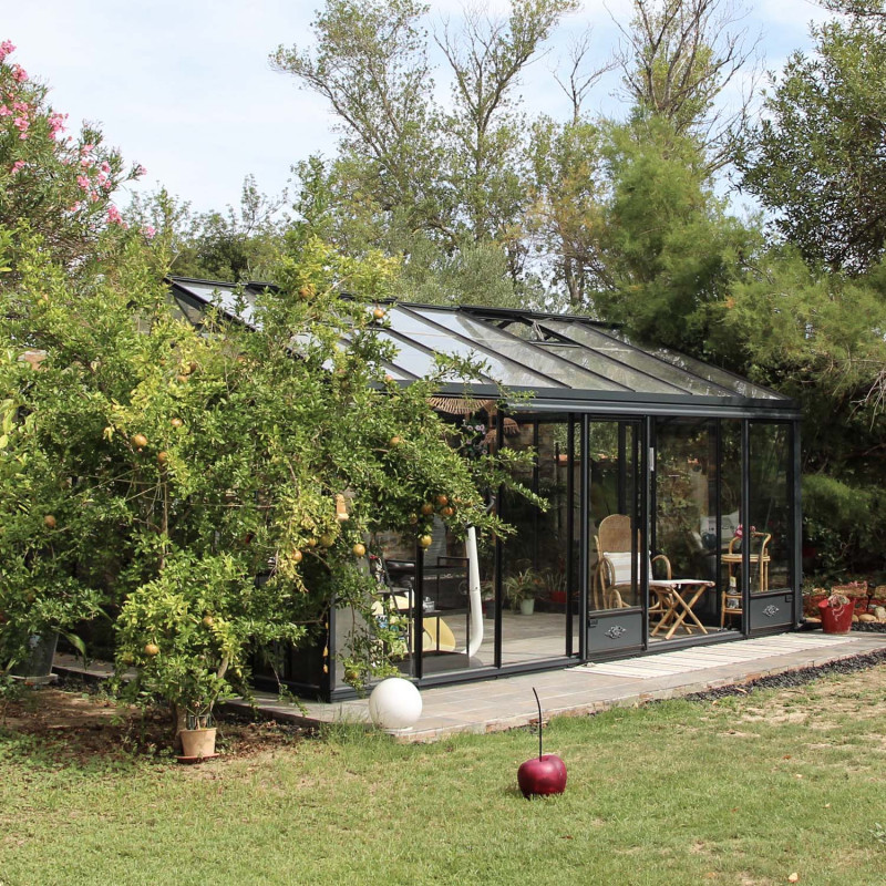 La losa permite aislar el invernadero del suelo: transforme su invernadero en un auténtico jardín de invierno o en una nueva sala luminosa y confortable, instalando muebles para disfrutar del entorno verde de su jardín.