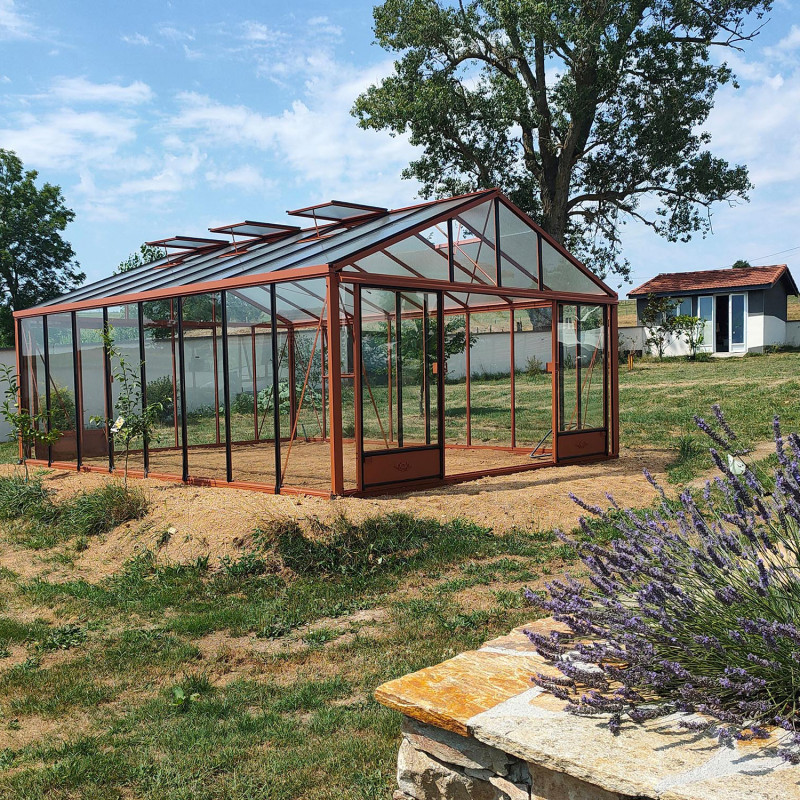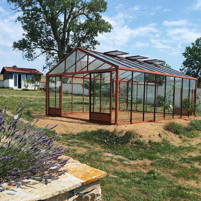 Con una fachada de 4,60 m, el invernadero en cristal templado y aluminio SUPRA está disponible en 5 longitudes desde 5,30 m hasta 8,30 m.