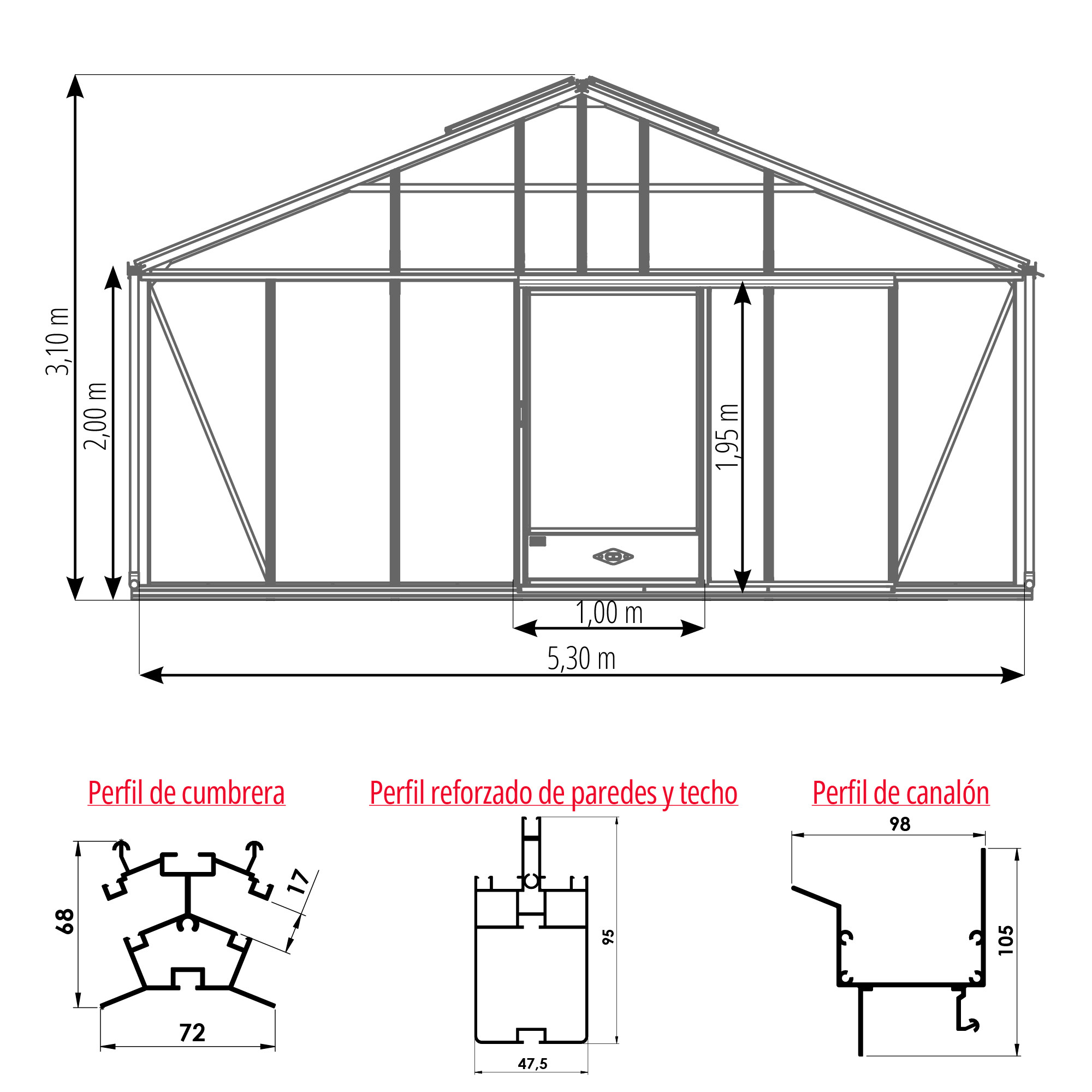 Dado su ancho de 5,30 m y su altura de cumbrera de 3,10 m, este modelo incorpora refuerzos estructurales específicamente adaptados a sus dimensiones, para garantizar la estabilidad del conjunto.